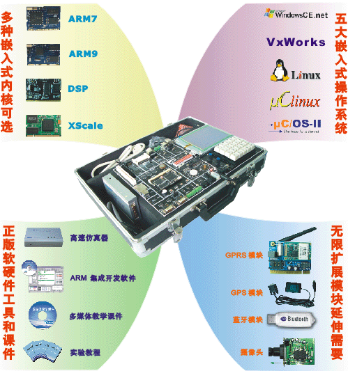 Embest EDUKIT-III教學實驗系統提供了多操作系統強大支持,包括目前流行的UcosII,ucLinux,Linux,WinCE以及Vxworks等等。全部操作系統提供詳細的移植例子,BSP源代碼,操作系統源代碼,以便老師進行科研與教學。